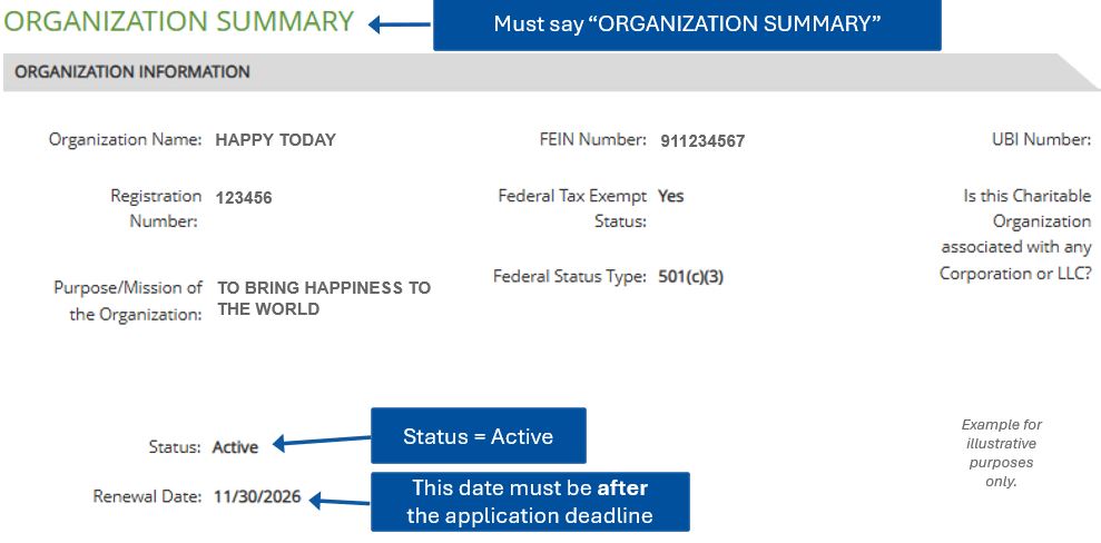 - A screenshot or PDF of your organization's listing on the Washington Secretary of State's charities program website. Access the charities/fundraiser/trust search here. .